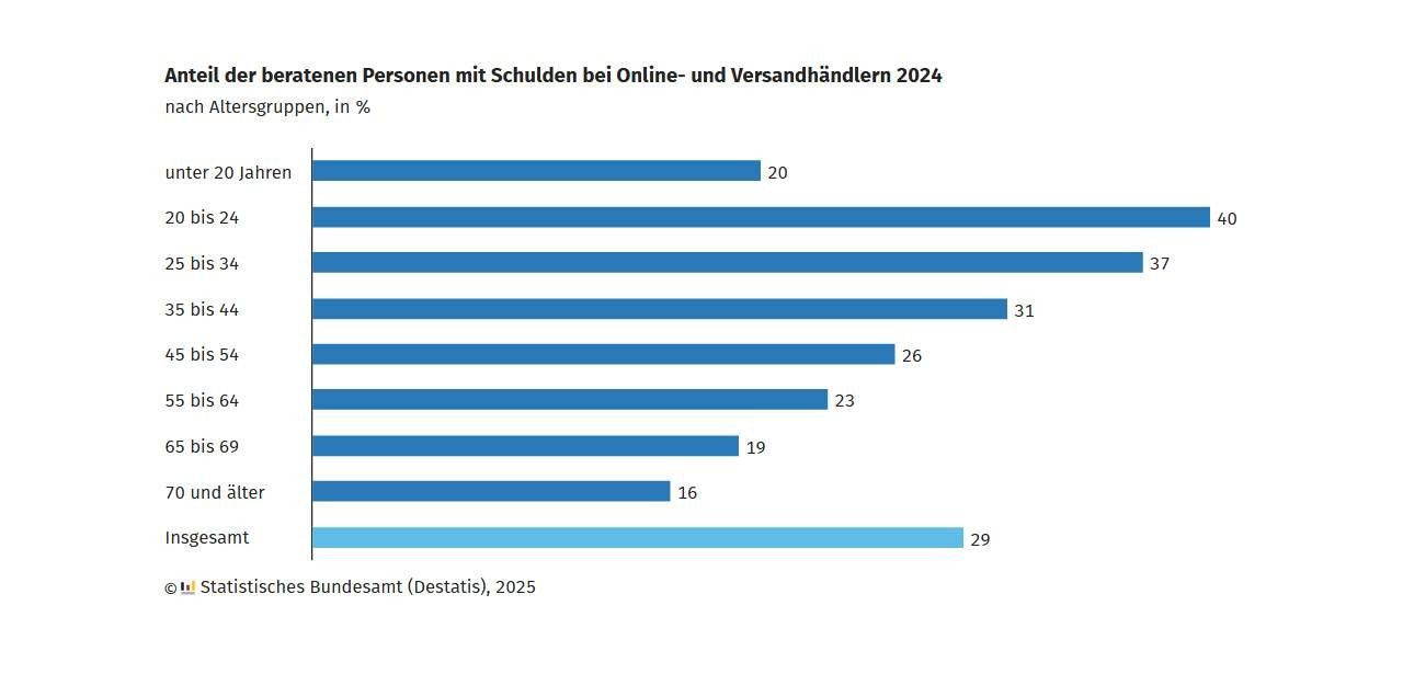 Nach den Ergebnissen der Überschuldungsstatistik des Statistischen Bundesamts aus 2024 haben 29 Prozent der rund 577400 Ratsuchern bei Schuldnerberatungsstellen offene Zahlungen an Online- und Versandhändler. Die durchschnittliche Rückstandshöhe betrug 644 Euro. Junge Personen bis zum Alter von 24 Jahren und Frauen sind überdurchschnittlich betroffen und weisen höhere Forderungssummen auf. Diese Rate ist seit 2019 um zwei Prozentpunkte gestiegen und verdeutlicht dringend zielgerichtete Beratungsansätze und Präventionsprogramme erfordern.