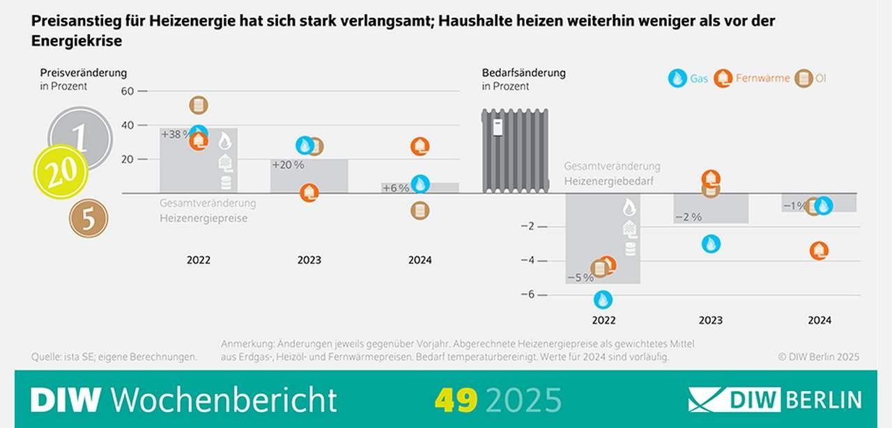 Nach Analyse der ISTA-Abrechnungen und ausgewerteter DIW-Daten verzeichneten die Heizenergiepreise 2024 einen vergleichsweise moderaten Preisanstieg von rund sechs Prozent. Im Vergleich dazu stiegen die Preise 2023 um 20 Prozent und 2022 um 38 Prozent. Ein gewichteter Durchschnittspreis aus Erdgas-, Heizöl- und Fernwärmepreisen illustriert die abgemilderte Dynamik. Die Ergebnisse basieren auf tatsächlichen Abrechnungen zahlreicher Zwei- und Mehrfamilienhäuser und eigenen Modellrechnungen des Deutsche Instituts für Wirtschaftsforschung. Dadurch wird ersichtlich, dass die Energiepreisentwicklung im Wärmesektor agil nachgelassen hat.